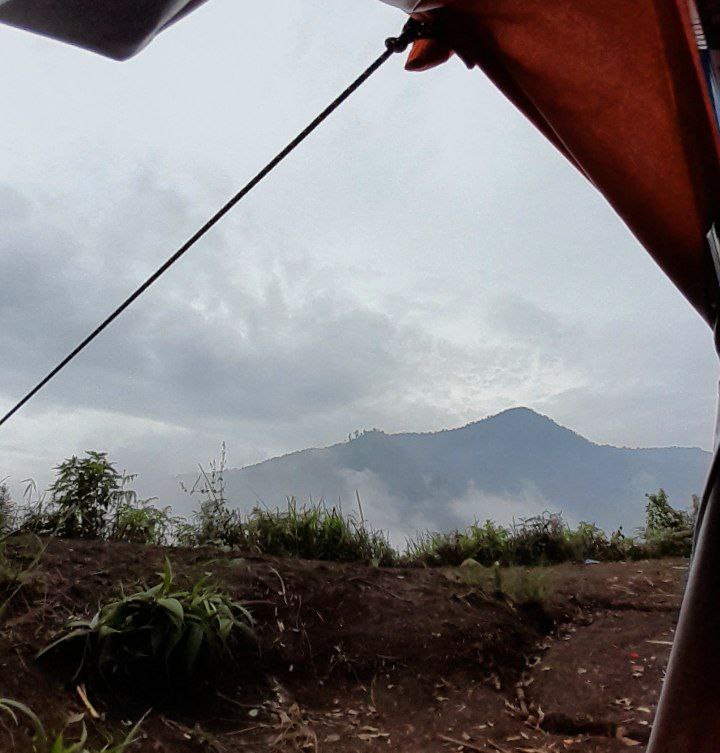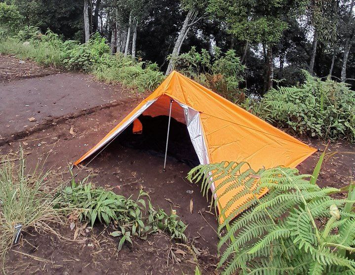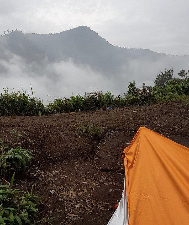 Akhirnya sampai di puncak dengan waktu 55 menit dari basecamp. Puncak Sangar ini memiliki ketinggian 1690 mdpl. Kondisi cuaca saat sampai puncak sedang berkabut. Saya pun bergegas mendirikan shelter sederhana dari flysheet untuk beristirahat dan bersiap untuk menyiapkan makanan.