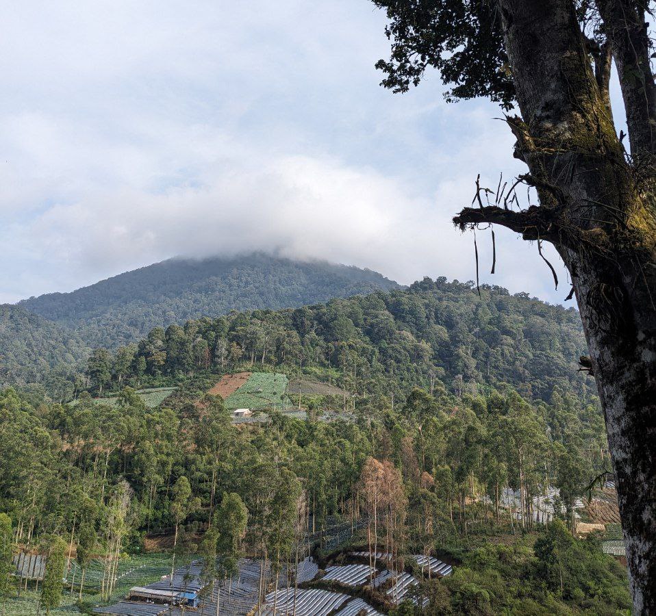 Kembali ke jalur. Jalur awal pendakian melewati jalan berbatu yang cukup lebar yang digunakan untuk kendaraan para petani. Setelah itu saya pun melipir masuk ke jalan pintas yang biasa dilewati pendaki, memasuki area perkebunan dengan jalur yang sedikit rimbun. Jalan pintas ini ujungnya akan menuju jalan berbatu kembali, sekedar untuk mengurangi jarak tempuh. Tampak dari kejauhan pemandangan gunung Bukit Tunggul yang sedikit berkabut.