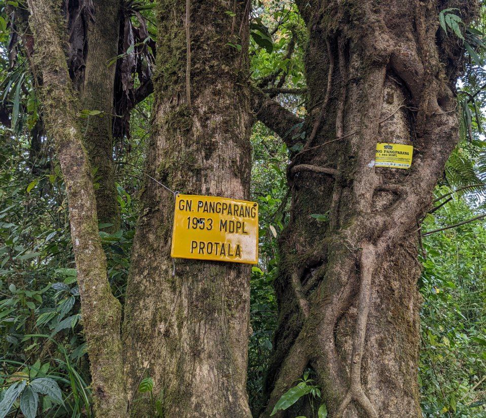 Jalur ke gunung Pangparang ini menanjak cukup curam, kurang lebih 30 menit saya naik hingga akhirnya menemukan plakat puncak. Area di puncak dengan ketinggian 1952 mdpl ini cukup luas, dikelilingi pohon dan semak belukar. Sekedar mengabadikan gambar, tak lama saya pun turun kembali ke persimpangan jalur dan melanjutkan perjalanan mengambil jalur menuju lembah tengkorak. Area ini masih sepi, bahkan saya belum bertemu dengan pendaki lain sejak berangkat dari basecamp.