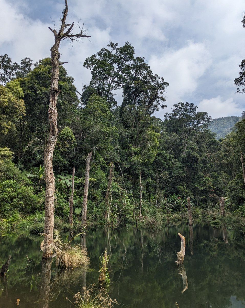 Karena ketinggian danau berada di sekitar 1500 mdpl sedangkan persimpangan jalur ini di 1700 mdpl maka jalur menuju danau menurun landai, namun di beberapa titik ada juga yang cukup curam. Mendekati area danau kita akan menemukan aliran air yang cukup deras dengan airnya yang segar. Saya menyempatkan melipir untuk sekedar membasuh muka dan merasakan dinginnya air yang melimpah mengalir diantara bebatuan. Di pinggir jalur pun kita akan menemui aliran air dengan suara gemerciknya.