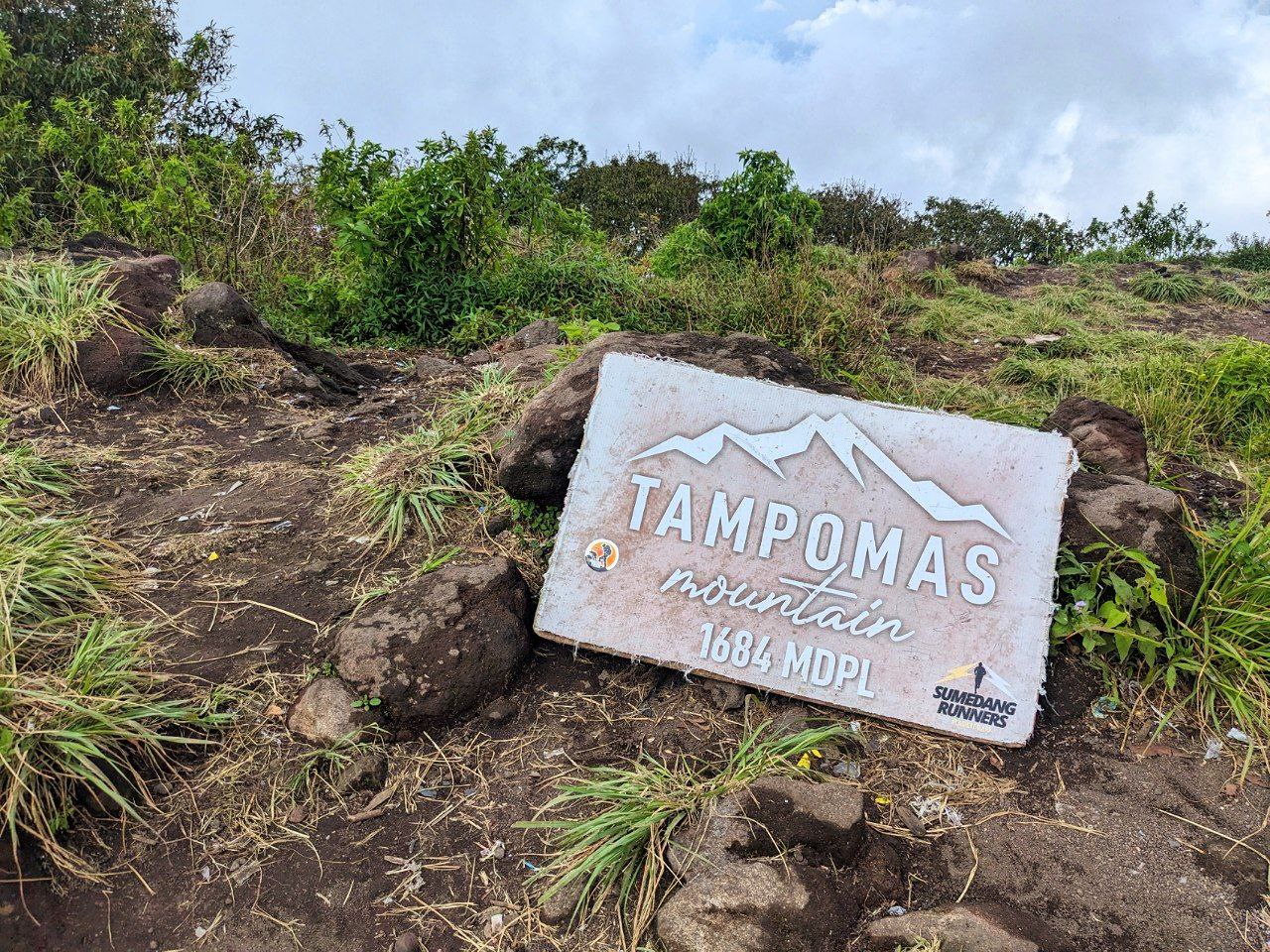 Akhirnya sampai di Puncak Tampomas pada ketinggian 1684 mdpl pada pukul 09.44. Kurang lebih hampir dua jam dari basecamp tadi. Area masih sepi karena para pendaki lain masih berjalan menuju puncak. Kali ini pemandangan ke bawah tertutup awan tebal dan sesekali tertutup kabut dengan cuaca cukup cerah. Saya pun istirahat sembari memakan bekal makanan berat yang sudah dibeli sebagai asupan energi buat turun ke basecamp.