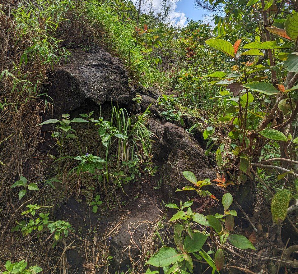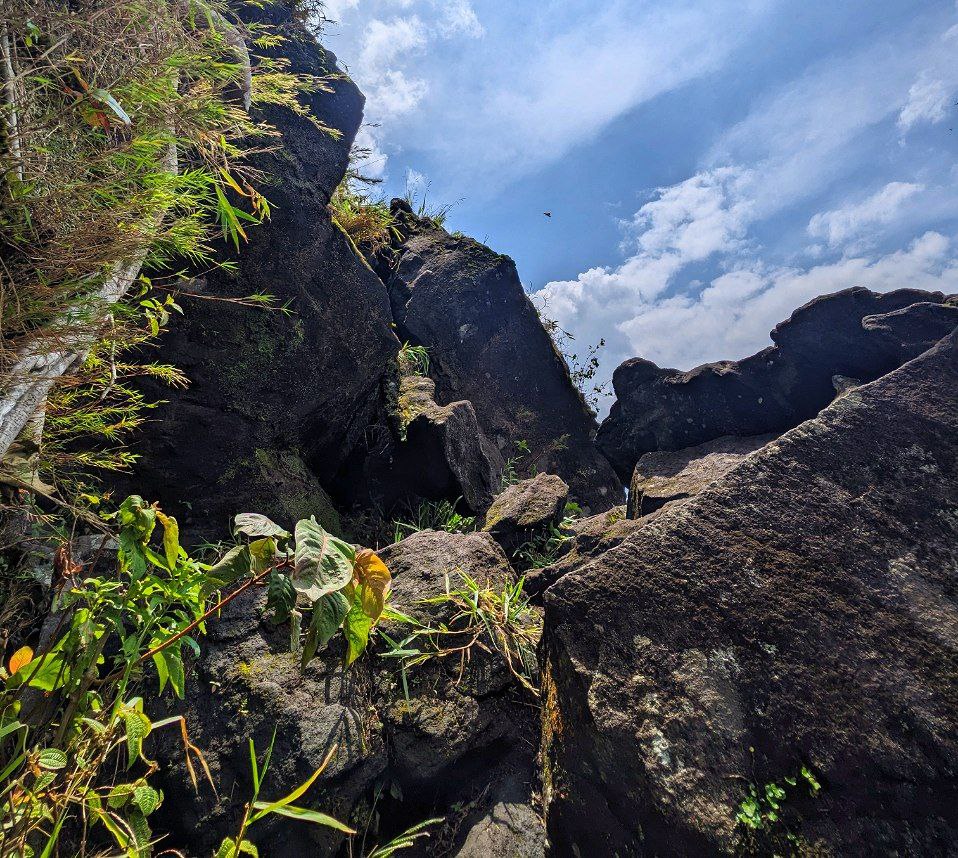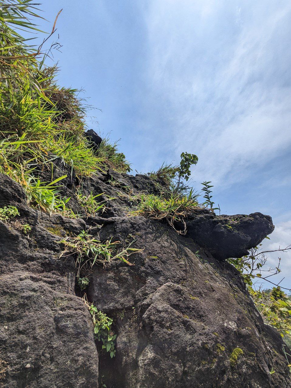 Kira-kira 50 meter sebelum puncak, jalur yang dilalui sebagian besar berupa susunan dari bongkahan batu besar. Sangat dibutuhkan kehati-hatian untuk melangkah. Bukan hanya kaki yang harus mencari pijakan untuk melangkah namun tangan pun harus gesit mencari pegangan. Apalagi 10 meter sebelum puncak, jalur batu yang harus dilalui benar-benar vertikal, dengan bagian sampingnya langsung jurang. Sempat ragu untuk naik karena takutnya ini bukan jalur untuk naik ke puncak.