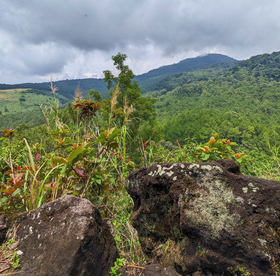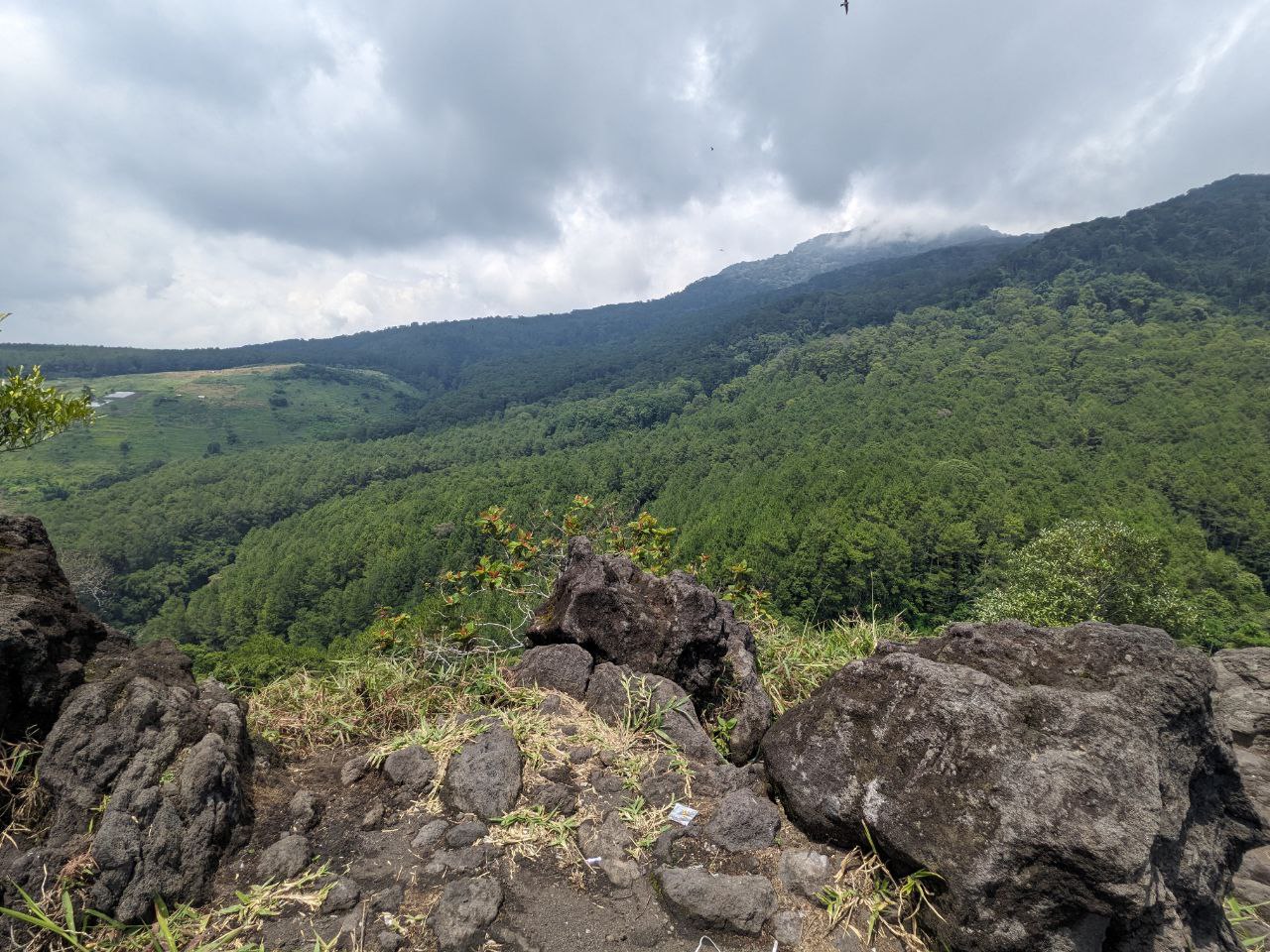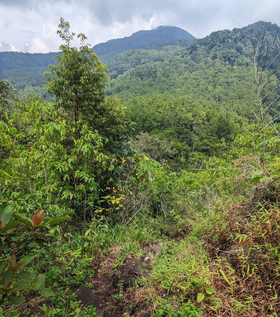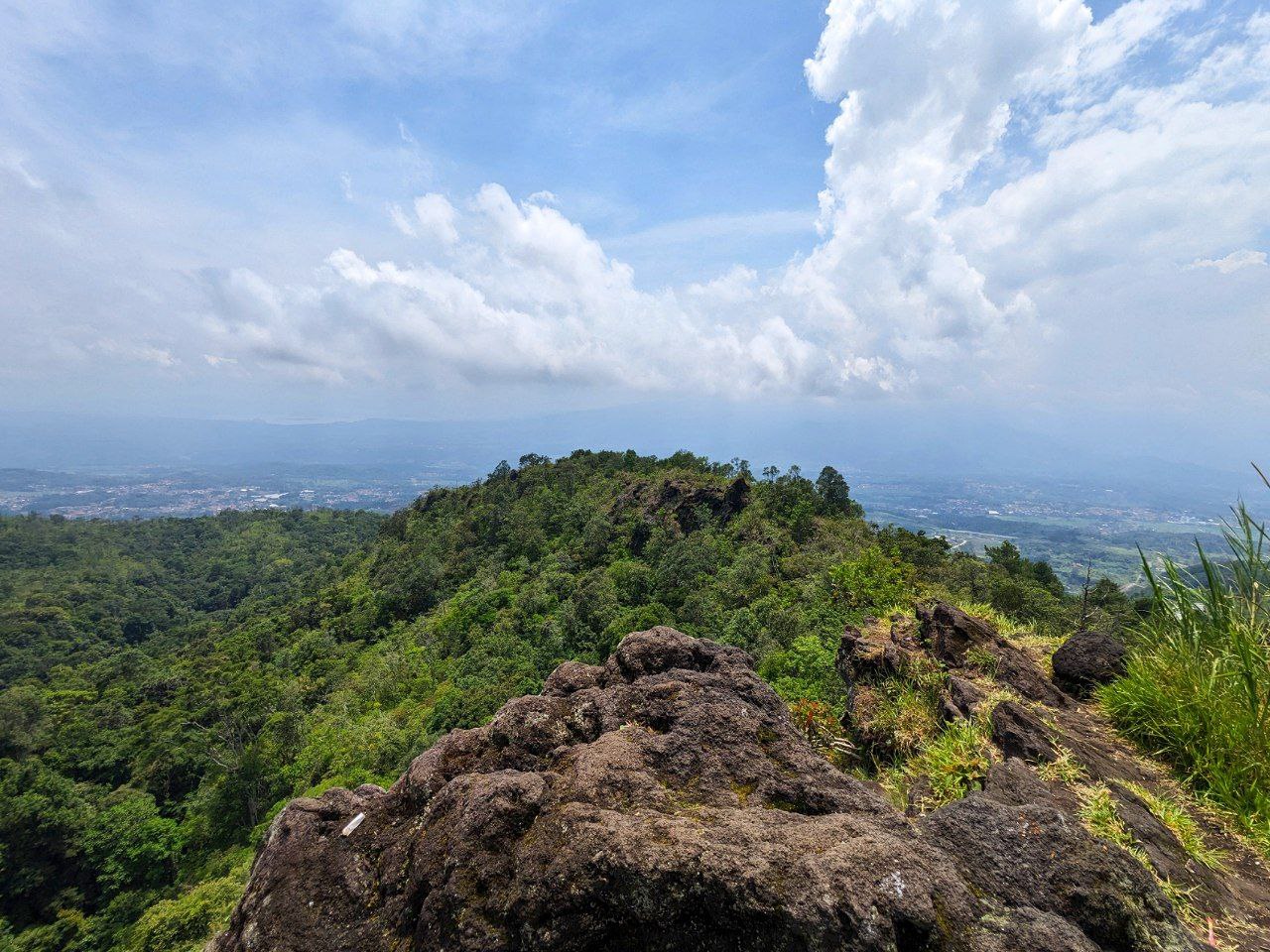 Kondisi di jalur ini diawali dengan lebatnya pohon di kiri dan kanan, memberikan hawa sejuk di siang hari ini. Namun jalur sedikit demi sedikit mulai terbuka ketika mendekati puncak, sehingga matahari yang cukup terik di siang hari ini lumayan menyengat kulit. Bersamaan dengan mulai terbukanya jalur maka mulai tampak jelas pula pemandangan pegunungan dari sini.